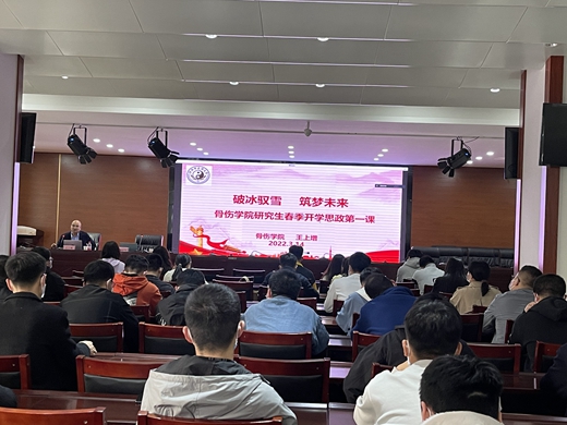 为深入学习习近平新时代中国特色社会主义思想,贯彻落实省委高校工委、省教育厅的通知要求及校党办《关于上好2022年春季开学思政第一课的通知》要求,结合我校常态化疫情防控要求,经周密安排、精心准备,骨伤学院于3月14日在东风路校区一楼会议室成功举办了春季“开学思政第一课”,骨伤学院副院长王上增以《破冰驭雪 筑梦未来》为题,以线上线下相结合的方式为研究生进行授课,骨伤学院全体研究生参加了本次学习。