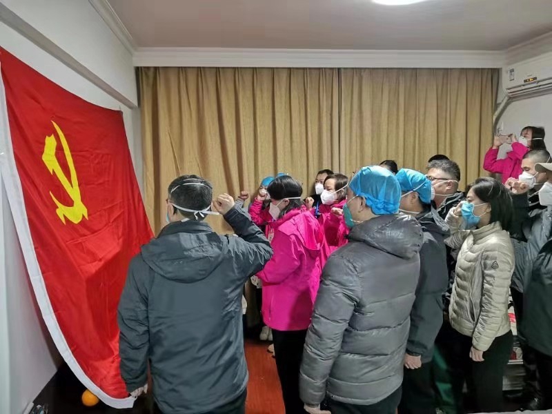 临时党支部抵达武汉后召开了支部大会,按照程序选举王丽辉同志任支部书记,闫东升同志任支部副书记,王明航同志任组织委员,温世宝同志任纪检委员,杜鹃同志任宣传委员。为了在前线充分发挥党员的模范带头作用,鼓舞士气,支委会决定在当晚举行一次特殊的主题党日活动:在疫区重温入党誓词。