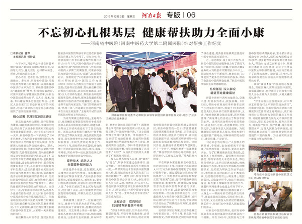 编者按:自我院与新县中医院正式“联姻”结成帮扶对子这一年多以来,从人才、技术、设备、专科建设等多方面进行帮扶,线上线下齐发力,让新县中医院的综合服务能力有了质的飞跃。除新县外,我院还与兰考、固始县中医院等结成帮扶对子,让贫困县群众在家门口就享受到了高水平的中医服务,为我省全面小康之路提供了坚实的健康保障。12月3日《河南日报》06版对我院的结对帮扶工作做了系统的报道,原文如下: