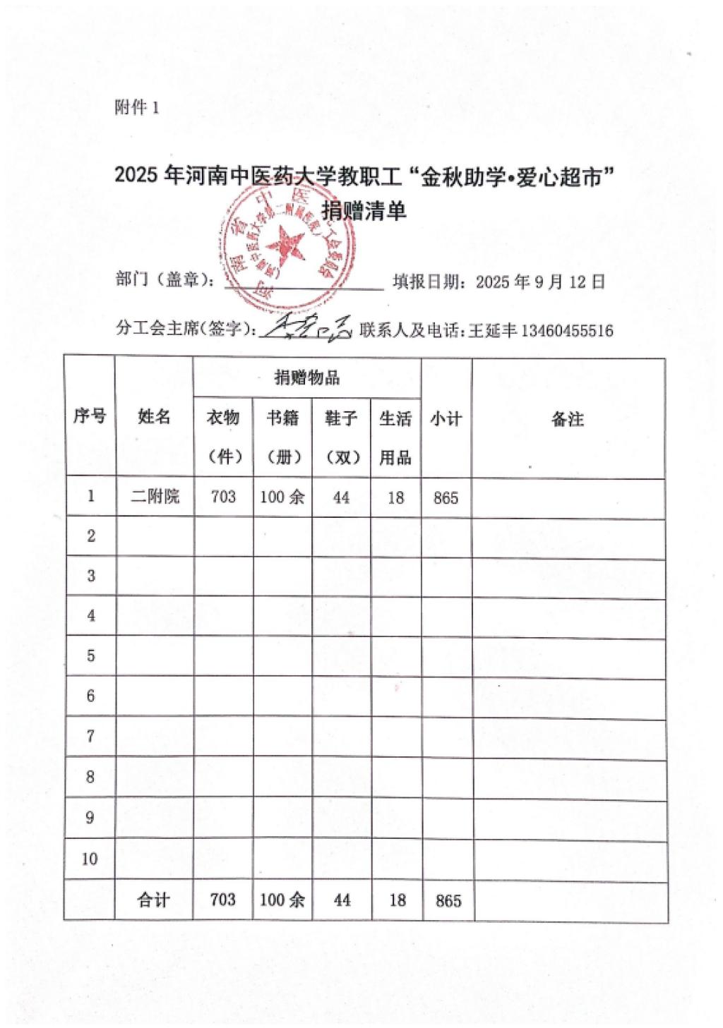 2025年9月1日至15日,河南中医药大学第二附属医院工会积极响应校工会号召,组织全院职工为校内经济困难学生捐赠衣物、书籍及生活用品,捐赠物品统一送往学校“白云苹基金会”爱心超市,为新生及面临物资短缺问题的学生提供实质帮助。