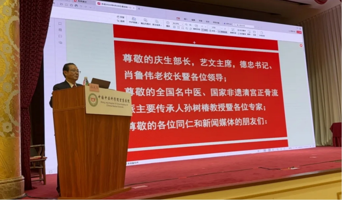 国医大师孙光荣教授、中国中医科学院党委书记查德忠相继发表讲话,开幕式的最后,北京市中医药管理局局长屠志涛通过视频的方式,向孙树椿教授送上了诚挚的祝贺。他们高度评价了孙教授在中医领域的卓越贡献,并期待他未来能够继续为中医事业添砖加瓦。“这既是清宫正骨流派学术交流后继有人、后继有德、后继有术的会议,又是学习全国名中医孙树椿教授德业双修成为骨伤专业真正中医人的会议。”孙光荣教授说。