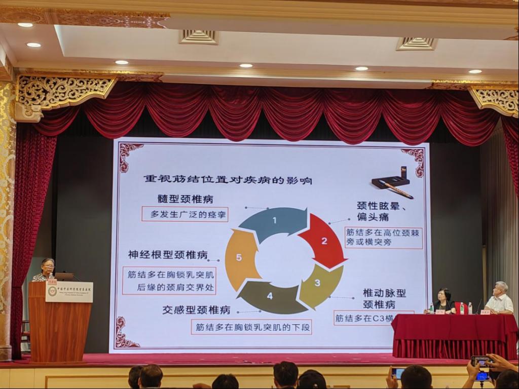 会议期间邓素玲教授分享了临床诊治颈椎病的经验心得,包括不同分型颈椎病筋结所在位置的不同以及自身对于清宫正骨手法治疗颈椎病的临床心得体会等。
