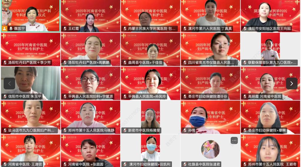 为进一步弘扬中医文化,提升护理人员的中医护理技能,2025年河南省中医妇产科专科护士培训班于今日顺利开班,来自全国各地的护理骨干齐聚一堂,共同开启这段探索中医智慧的成长之旅。河南省中医院护理部主任王红霞、妇产科主任姬霞、妇产科护士长张白云、全体培训学员齐聚云端。本次线上开班仪式由妇产科护士长张白云担任主持。