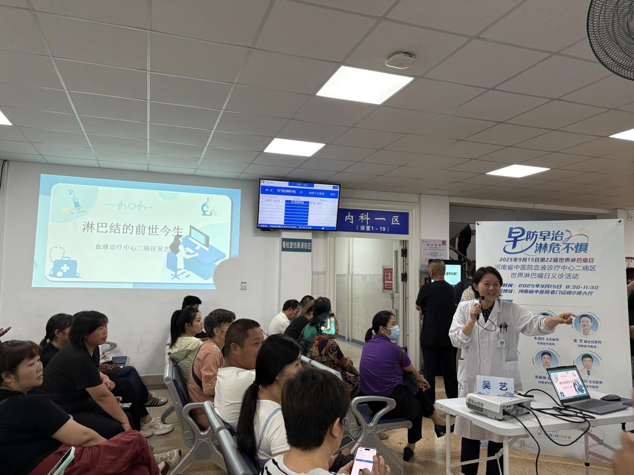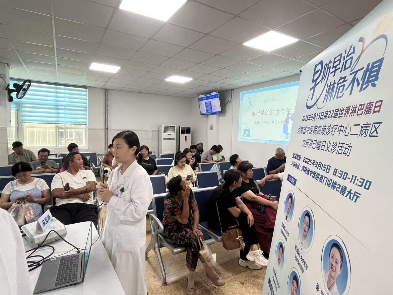 每年9月15日的“世界淋巴瘤宣传日”,以普及淋巴瘤防治知识、帮助公众识别恶性淋巴瘤早期症状、推动疾病早发现早治疗为核心宗旨。为响应这一理念,切实为群众提供淋巴瘤健康服务,2025年9月15日,河南省中医院血液二病区在门诊楼二楼开展世界淋巴瘤宣传日义诊活动,主题为“早防早治、淋危不惧”,刘现辉主任、韦润红主任医师、吴艺副主任医师、王河春,王洪兴主治医师、宋亚琳医师等专家团队坐镇,为市民带来专业的淋巴瘤防治科普与诊疗服务。