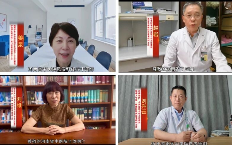 本次会议特别邀请到四位国内风湿领域的领军专家:中华医学会风湿病分会主任委员、北京协和医院赵岩教授、中华中医药学会风湿病分会主任委员、中国中医科学院广安门医院姜泉教授、中国中西医结合学会风湿病分会主任委员、天津中医药大学第一附属医院刘维教授、河南省医学会风湿病分会主任委员、郑州大学第一附属医院刘升云教授。他们虽未能亲临现场,却特意提前录制了致辞视频,为大会送上专业指导与诚挚祝福。