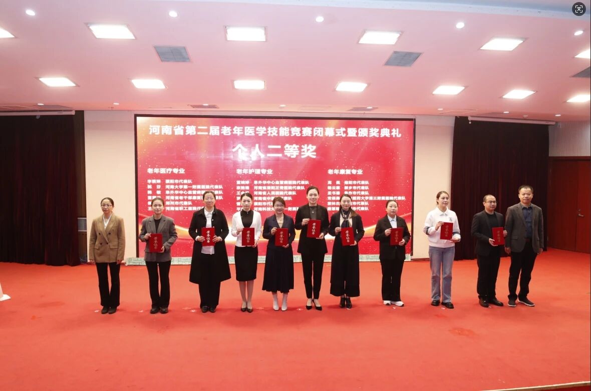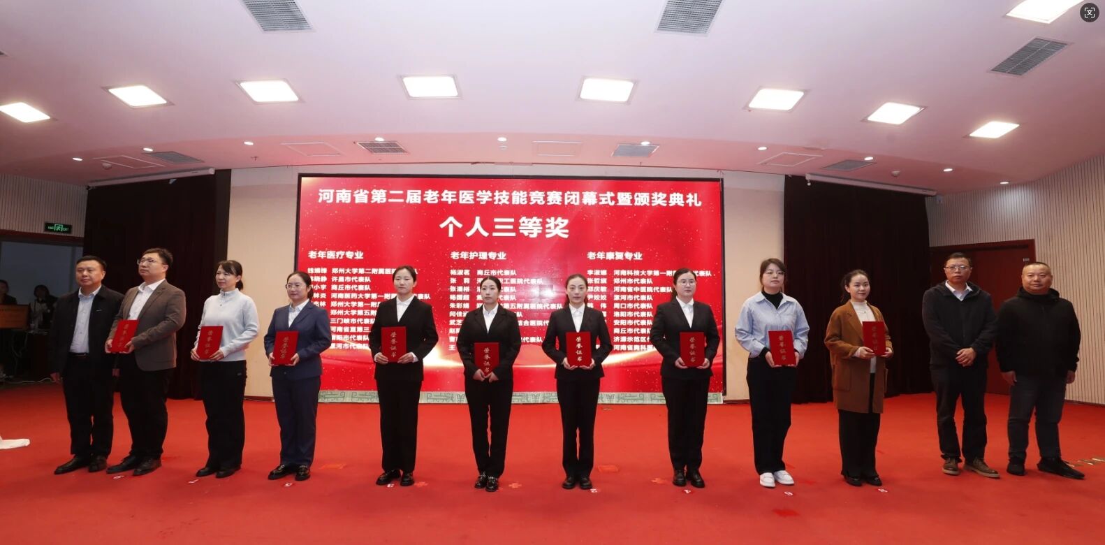 近日,河南省第二届老年医学技能竞赛省级决赛圆满落幕。本届竞赛由河南省卫生健康委联合省总工会、省民政厅、省老龄工作委员会办公室共同主办,河南中医药大学、河南省中医院、医药卫生报社协办,是全省老年医学领域一次高水平的专业赛事。我院积极组织参赛,并取得优异成绩,荣获团体三等奖。在个人项目中,我院选派选手表现突出,老年病科罗会敏荣获护理专业个人二等奖,康复科邵庆敏荣获康复专业个人三等奖。