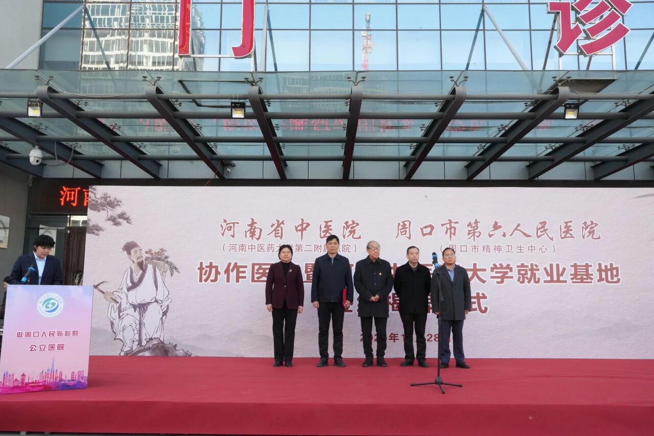 2025年11月28日上午,我院副院长陈建设、副院长杜旭召携全国名中医毛德西教授及部分科室专家、护理骨干组成的专家团一行,赴周口市第六人民医院开展“协作医院”及“河南中医药大学就业基地”揭牌及义诊活动。周口市卫生健康委二级调研员王玉栋莅临现场,周口市第六人民医院院长师瑞霞及院领导班子全体成员共同参加。仪式由郭艳副院长主持。
