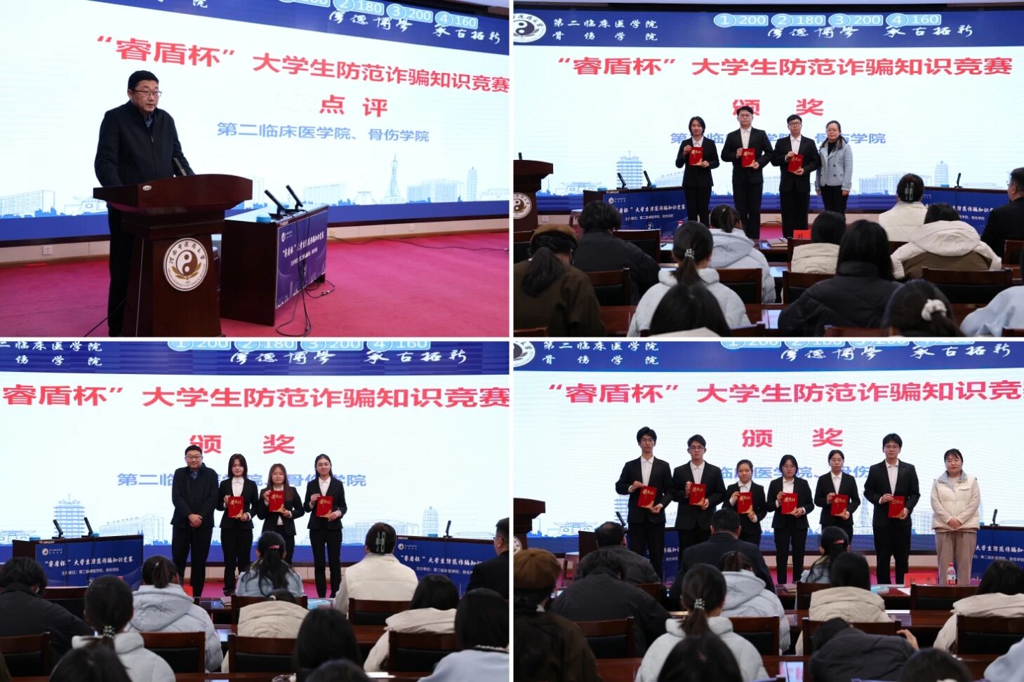 为深化反诈宣传教育,筑牢校园安全防线,第二临床医学院、骨伤学院近期组织"睿盾杯"大学生防范诈骗知识竞赛。自11月中旬启动以来,全院学生积极响应,通过线上答题、班级选拔等形式展开初赛角逐,最终4支学生代表队脱颖而出晋级决赛。12月2日下午,决赛在龙子湖校区图书馆第二报告厅成功举办。比赛现场邀请学院班主任代表校党委巡察办公室主任刘杰、马克思主义学院刘惠老师担任评委嘉宾,学院党委副书记陈戈、各年级辅导员以及近200名师生参加活动。