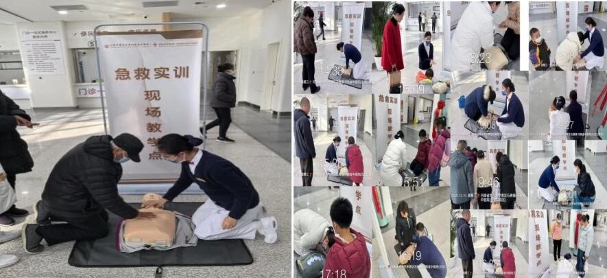 在生活中,心脏骤停、异物卡喉等突发意外往往猝不及防 ,黄金急救时间转瞬即逝,而多数人因缺乏专业急救知识和实操能力,只能眼睁睁错失良机,因此,我院将急救知识现场互动教学作为重点便民服务,在门诊大厅常态化开展教学活动,让市民在就诊之余,轻松掌握心肺复苏、海姆立克等实用急救技能。