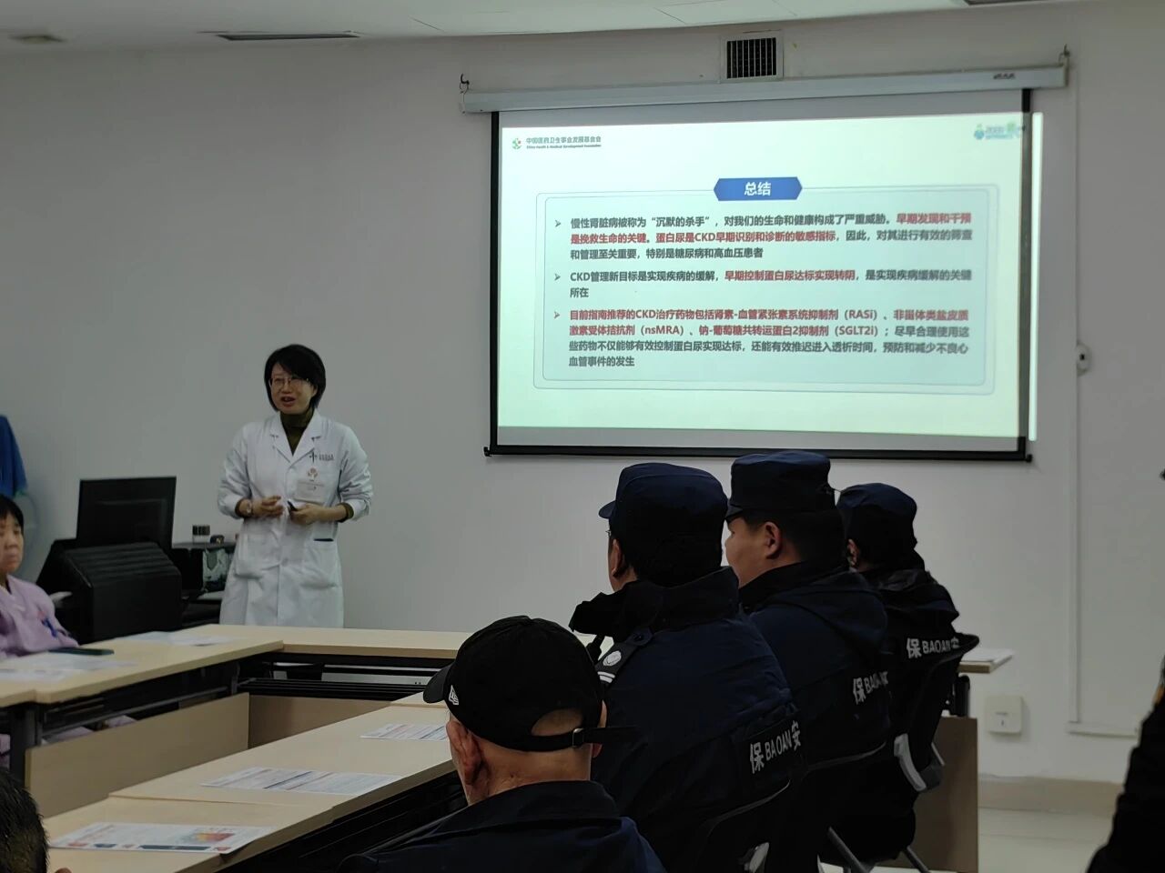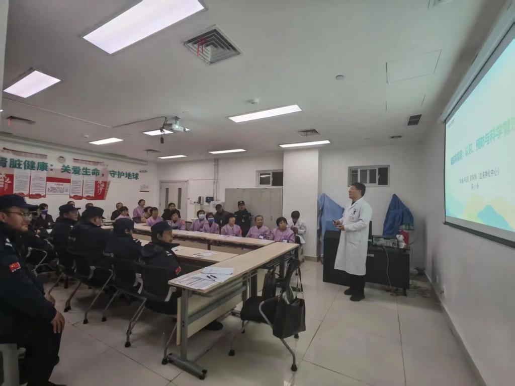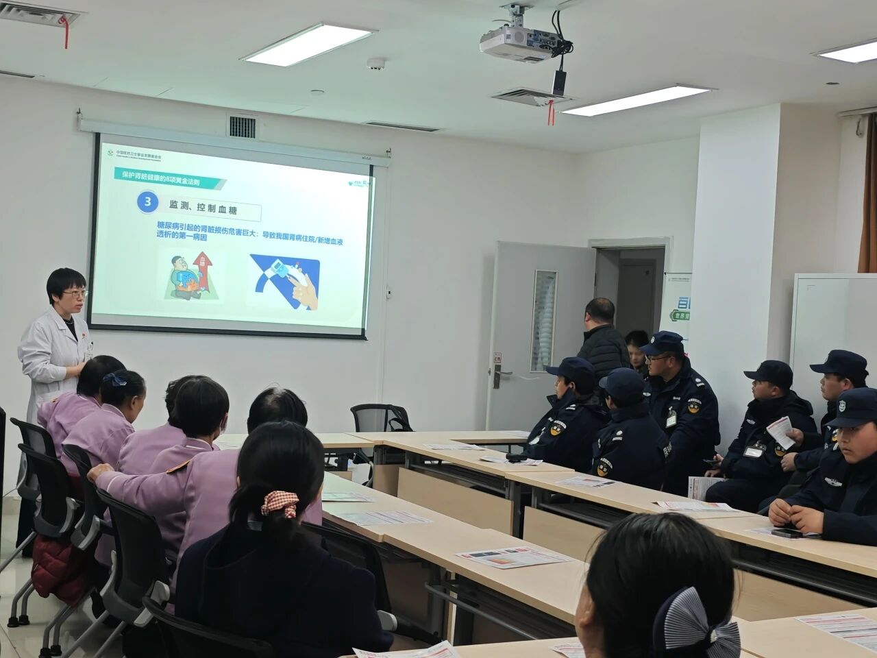 3月11日晚,韩佳瑞、陈小永、解红霞三位医生走进综合楼示教室,为到场医院安保师傅以及保洁叔叔阿姨们科普肾脏保健知识。