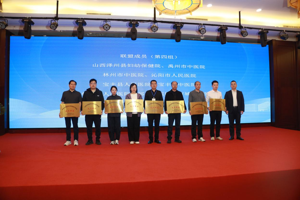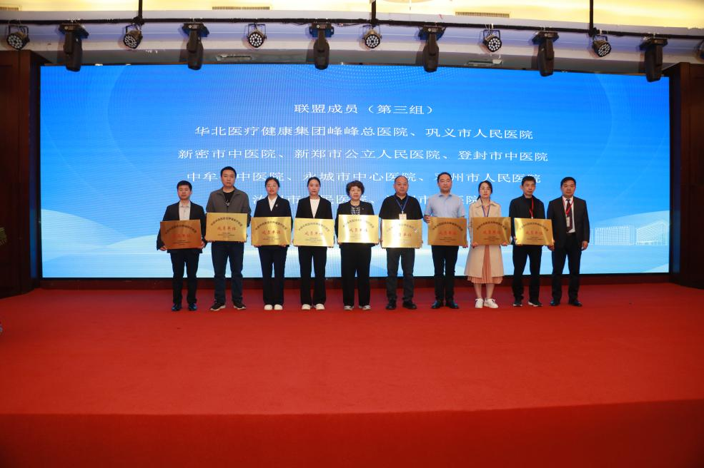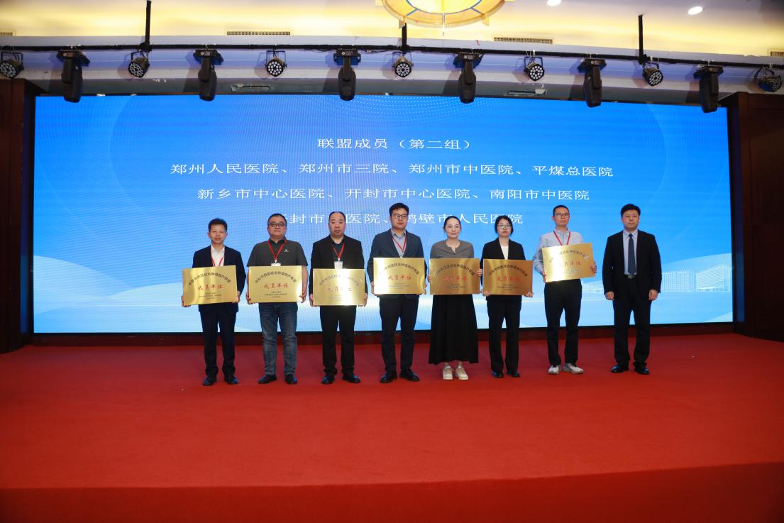 我院院长冯晓东为第一组联盟成员单位授牌(河南中医药大学三附院、河南省中西医结合医院、郑州大学第二附属医院、郑州大学第三附属医院、郑州大学第五附属医院、河南医药大学三附院、山西医科大学第二医院、徐州医科大学附属医院、山西侯马市人民医院)