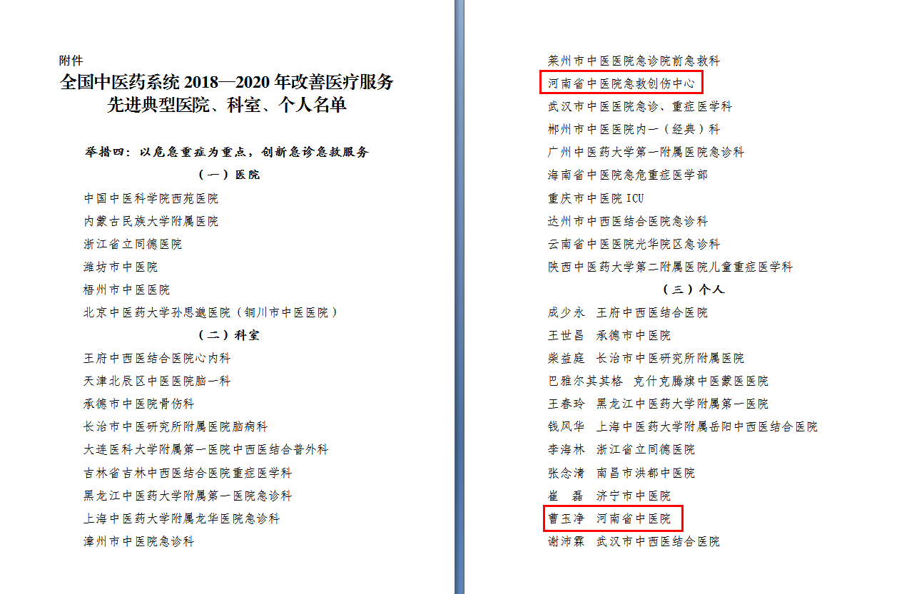 根据2021年03月23日《国家中医药管理局办公室关于通报表扬中医药系统2018-2020年改善医疗服务先进典型的通知》(国中医药办医政函〔2021〕80号),我院急救创伤中心和中心曹玉净主任分别喜获“举措四:以危急重症为重点,创新急诊急救服务”先进科室、先进个人表彰。