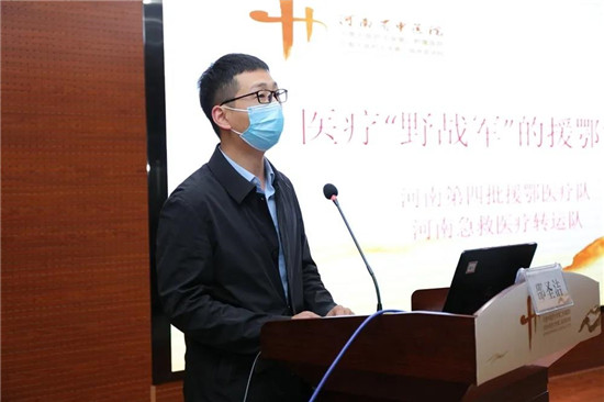 一天88个电话(不包括微信),在前一天凌晨2点多休息的情况下,接下来一天早8点开始的26个小时内,只休息了不到5个小时,这就是在江夏方舱医院开舱初期,58岁的郑福增副院长的工作强度。在报告会上,他从医疗队筹建、出征准备、江夏方舱医院架构搭建、制度制定落实、确诊患者救治等方面,为大家分享了他的援鄂经历。他说,最难忘的事是中医方舱的设计者张伯礼院士对大家的激励,最感动的事是年轻队员在这次疫情防控阻击战中的担当和成长,最大的体会是中医抗击新冠肺炎有药可用、确实有效、可加速康复。他总结了团队的几个优势。一是医院党委为医疗队配备了随队感控专家,为确保医务人员零感染提供了保障;二是团队中的耳鼻喉科专家,在方舱内开展的咽拭子检测对比研究、院内制剂“清肺排痰滴剂”救治病人,为提高检测的准确性、病人救治成功率做出了很大的贡献;三是在派遣第五批国家(河南)中医医疗队时,注重选派中医博士进舱开展科研观察,科研数据收集的完整性得到了张伯礼院士的肯定;四是随队的后勤保障人员出色的工作确保了医护人员的营养和工作生活便利,为保障医护人员“零感染”做出了重要贡献。他表示,大疫无情,大爱无疆,国家危难之时,医务工作者就应该响应党的号召,挺身而出。3月10日作为代表参加习近平总书记召开的视频会议,他更深切地感受到了祖国向世界贡献中国力量、中国智慧、中国方案的自豪。