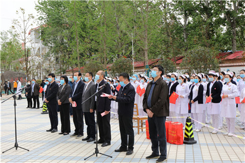 下午两点半,2号住院部悬挂着“欢迎抗疫英雄回家”的大红横幅,住院部楼前广场气氛热烈,大家手拿红旗,脸上洋溢着重逢的喜悦。大会开始,张佩江副书记首先宣读了国家中医药管理局的感谢信,接着宣读了河南省卫健委对援鄂医疗队员及全体参与疫情防控职工的慰问信。信中对全院职工坚决响应党中央号召,按照国家和全省统一部署,在新冠肺炎疫情防控工作中发挥的积极作用给予了充分的肯定,对医院运用中医药抗疫的显著成效表示了热烈的祝贺和衷心的感谢。