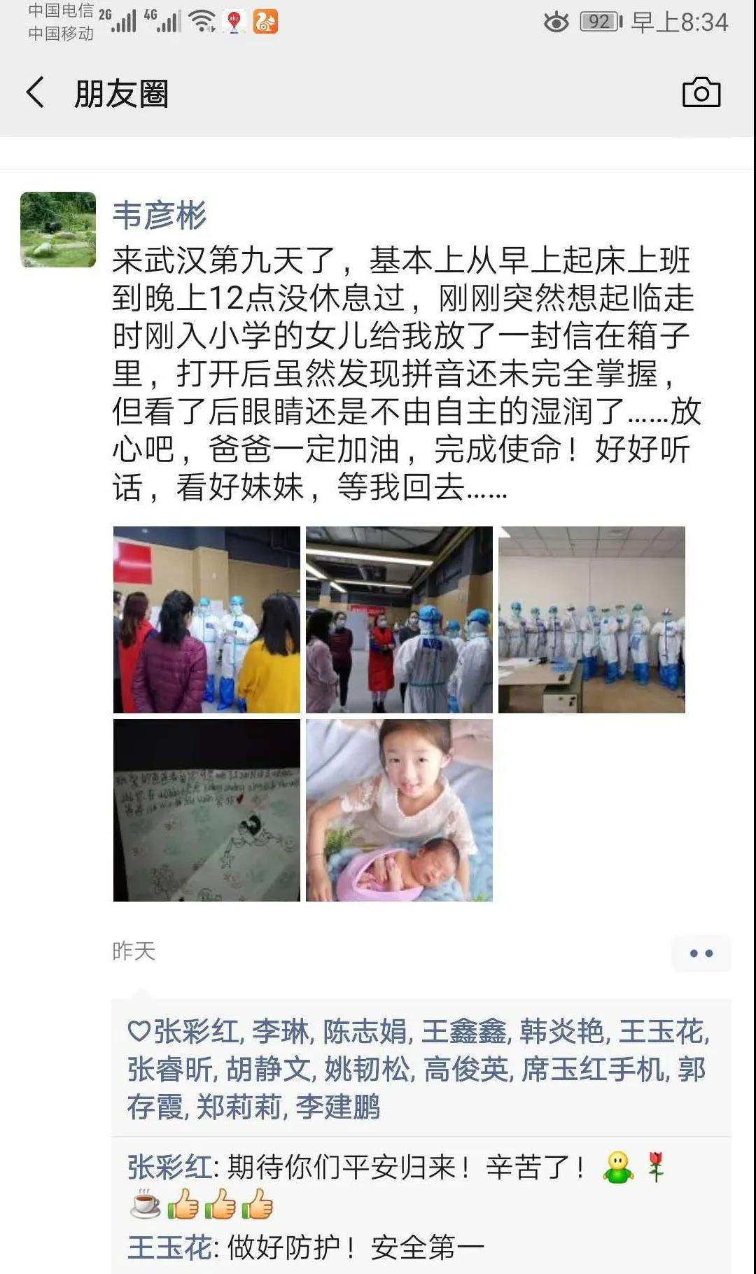 同事问他怎么打个电话就做通妻子的工作时,小韦笑了笑说:疫情刚开始时就不停的给媳妇儿打预防针,做为医务人员得有这个思想准备,作为医务工作者的家属也得有这个觉悟。出发时问他有什么感想,韦炎彬也只是简简单单的说了一句“武汉加油,我们一定凯旋而归!”就和同伴们踏上了征程……