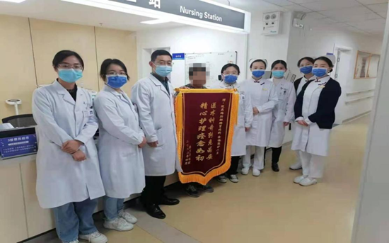 今天,患者李女士及其家属将印有“医术神奇转危为安、精心护理痊愈如初”的锦旗送到了肝胆脾胃病科迎宾路病区医护人员手中,向医护人员表示感谢。