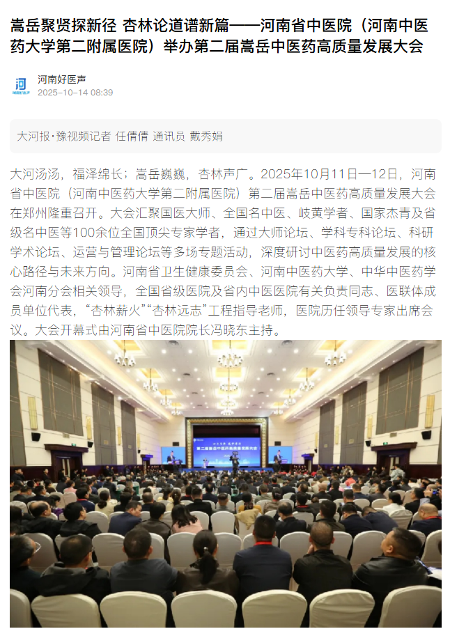 河南省中医院邀请了国内顶尖的中医药学界权威专家、知名学者参加发展大会,围绕中医药发展的前沿趋势、关键问题,分享真知灼见、碰撞思想火花,凝聚智慧、共绘未来。