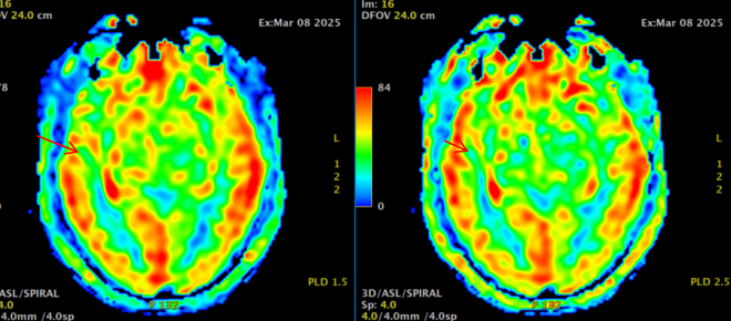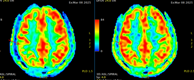 简单来说,它先在血管里“标记”一下流过的血液(就像给红细胞贴个小标签),然后等这些血流进大脑后,再拍一张照。通过对比“标记前”和“标记后”的图像,就能算出每个脑区有多少血在流动,还能得出具体的数值——相当于给大脑做一次“血流地图”。