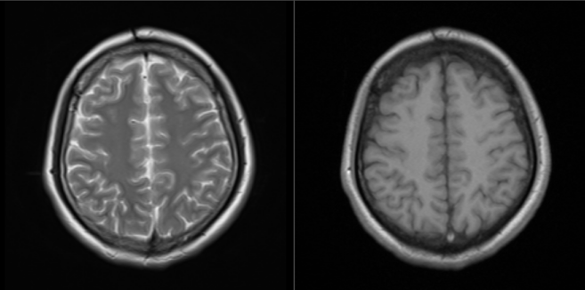 图2双侧额顶叶大小、形态及信号未见明显异常