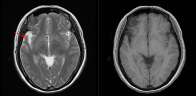 图1右侧颞叶萎缩,外侧裂较对侧增宽(红色箭头)