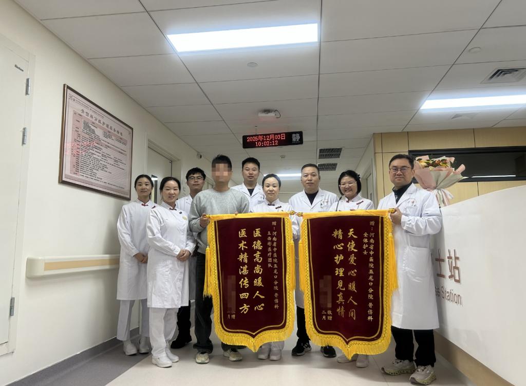 术后,在河南省中医院五龙口院区骨伤科医护团队的精心照料下,黄女士的右下肢肌力逐渐恢复,双腿麻木感明显减轻。经过一段时间的康复,黄女士已可以缓慢行走,精神状态也一天天好起来。她和家人由衷感谢地王西彬主任团队,感谢他们敢于承担风险、医术精湛、关怀备至。出院前,黄女士的家属特意给王西彬医疗团队和全体护理送来了锦旗,感谢道:“是你们给了她重新站起来的希望……”(文/王新立)
