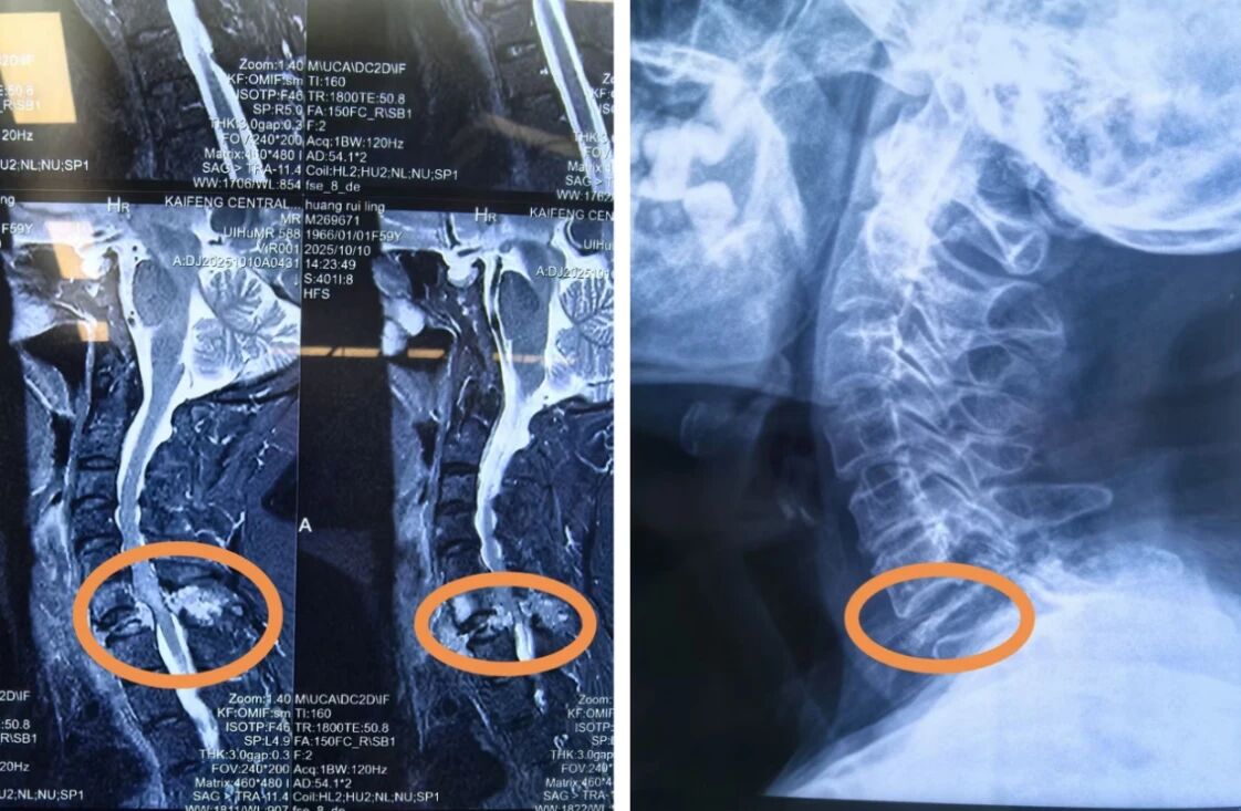 患者黄女士,59岁,家住开封市兰考县。15年前,她曾因乳腺癌在开封某三甲医院接受手术及放化疗。一个月前,她突然出现双下肢麻木,尤其是右下肢行走无力,于是前往开封市另一三甲医院就诊。检查发现,她的颈椎第6、7椎体有多处骨质破坏,其中颈7椎体已被严重压缩。经会诊转至骨科治疗。骨科初步计划手术治疗,但术前讨论认为手术风险过高,建议转至上级医院。患者随后转入该院肿瘤科,接受了局部放疗和靶向治疗,症状稍有缓解,但下肢功能仍未恢复。