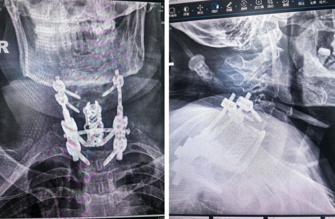经过周密准备,2025年11月22日,王西彬主任团队为黄女士实施了一期后路椎板附件瘤体切除+前路颈6、7椎体切除术。手术过程顺利,完整切除了肿瘤,并稳定了颈椎结构。