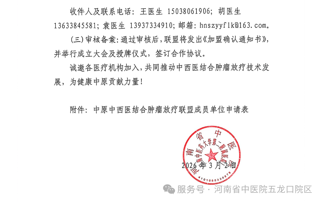 为推动中医药与放疗深度融合,提升肿瘤综合诊疗水平,优化患者就医体验,现正式成立中西医结合肿瘤放疗联盟。联盟以中西医结合、优势互补、协同发展为宗旨,汇聚中医、放疗、肿瘤多学科专业力量,开展学术交流、技术推广、人才培养与临床协作,为广大肿瘤患者提供更规范、更精准、更人性化的综合诊疗服务。同心致远,共筑健康,诚邀同道携手,共促中西医协同发展新篇章。